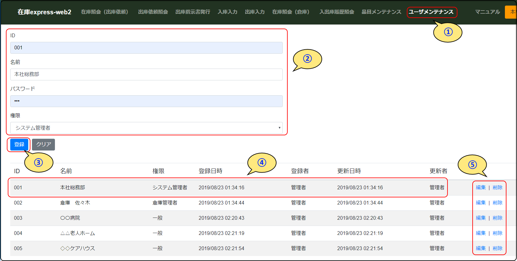 ユーザメンテナンスは、システム管理者がシステム管理者・倉庫管理者・一般ユーザの登録または編集等を行うことができます。