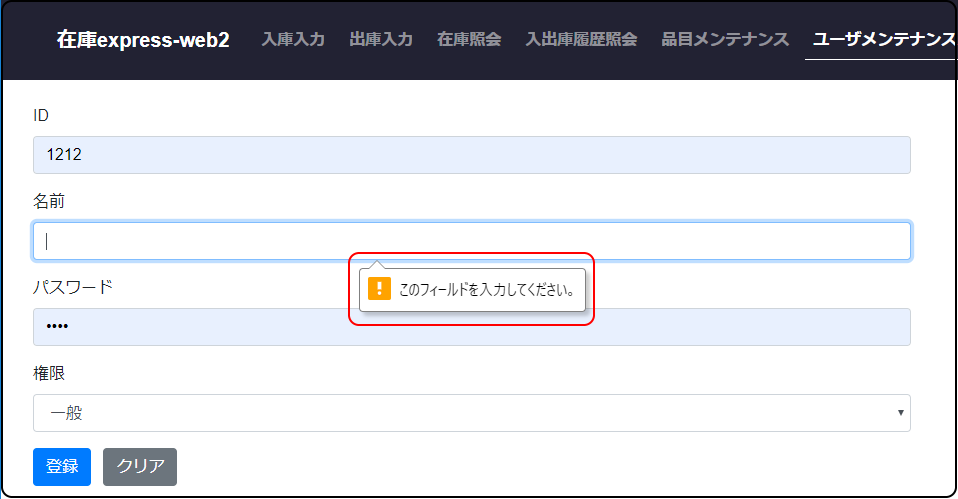 ② ID・名前・パスワードをそれぞれ入力し、権限をシステム管理者・倉庫管理者・一般から選択します。