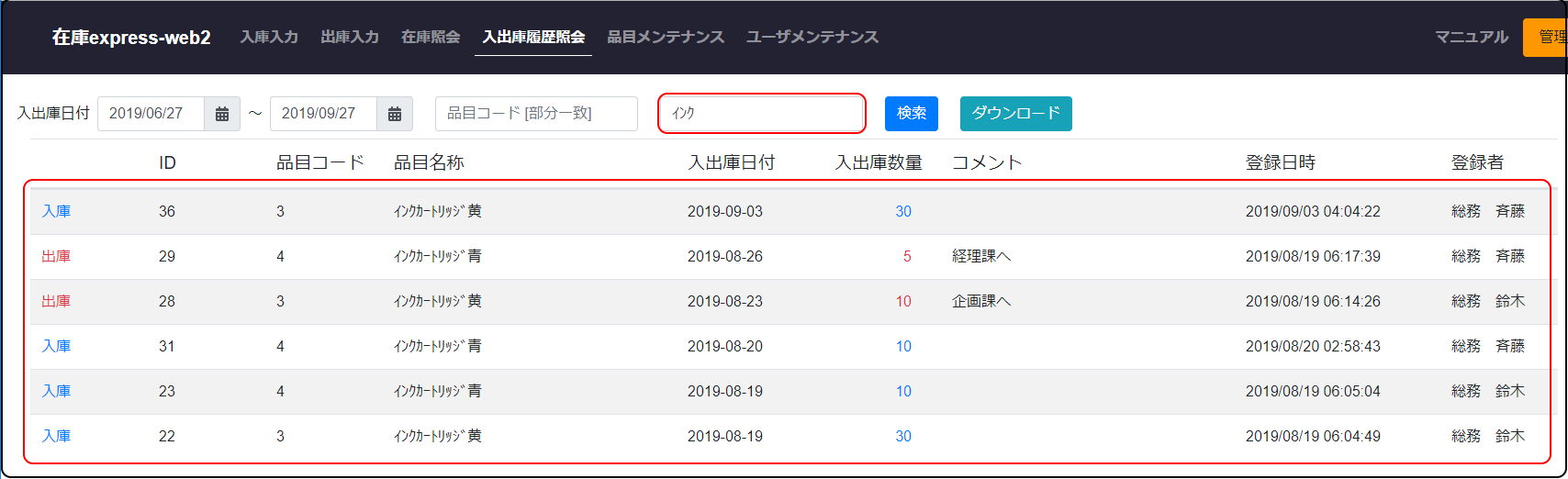②入出庫日付や品目コード・品目名称を入力して(部分一致可)絞込み検索ができます。