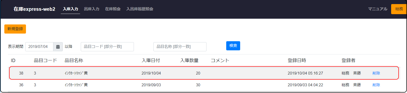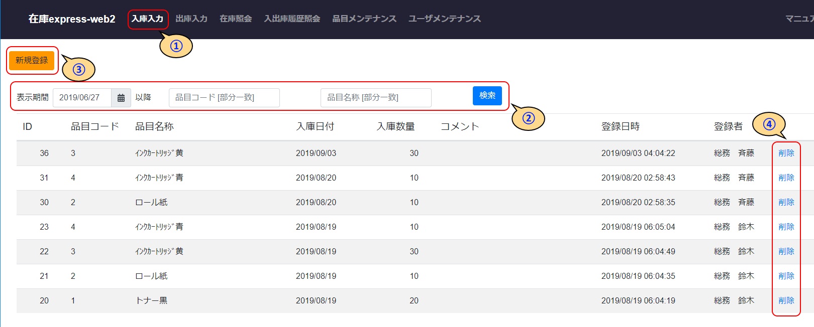 ①メニューから「入庫入力」を選択すると、今までの入庫履歴が表示されます。