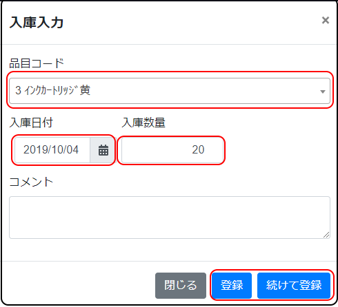 品目コード・入庫日付を選択または入力し、入庫数量を必ず入力(仮に20とします)して登録または続けて登録ボタンをクリックします。