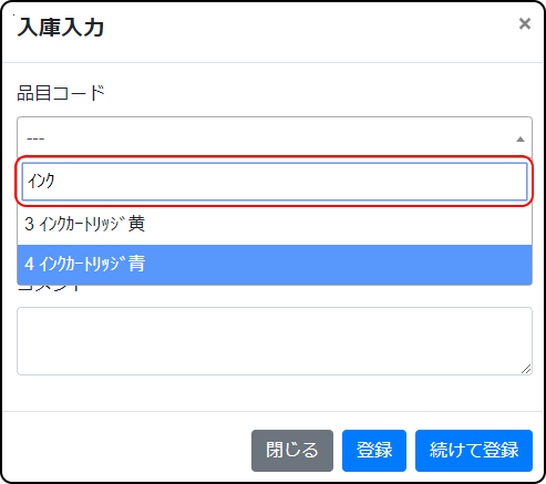 品目コード欄は、数字や文字を入力し、絞り込んで選択することもできます。