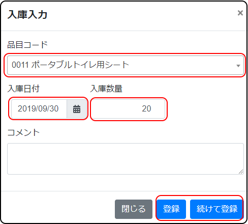 ③新たに入庫したい場合は、新規登録をクリックすると伝票入力用のサブ画面が表示されるので、品目コード・入庫日付を選択し、入庫数量を入力したあと登録ボタンをクリックします。