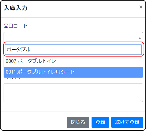 品目コード欄は、数字や文字を入力し、絞り込んで選択することもできます。