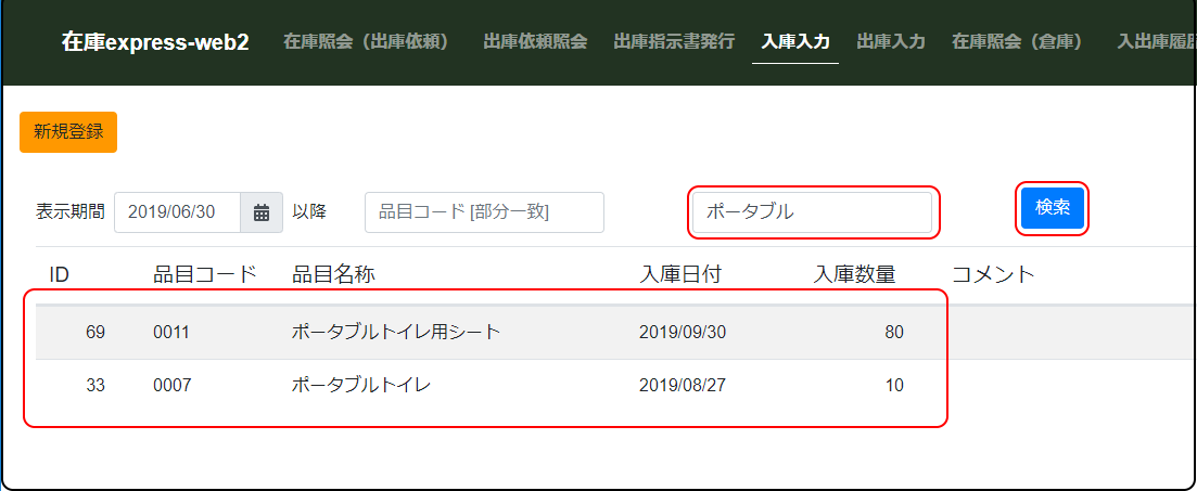 ①メニューから「入庫入力」を選択すると、今までの入庫履歴が表示されます。