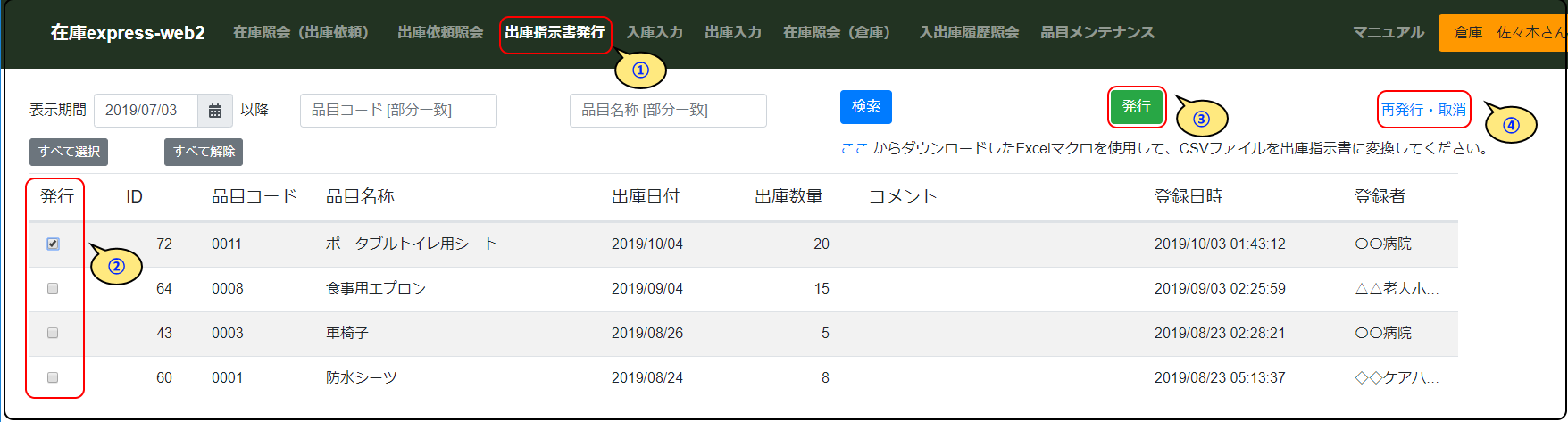 出庫指示書発行は、おもに倉庫管理者が使用します。