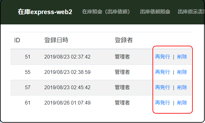 ④一度発行したものを再発行または削除したい場合は、再発行・削除ボタンをクリックし、表示された一覧の中からあてはまるものの右側にある再発行または削除ボタンどちらかをクリックします。
