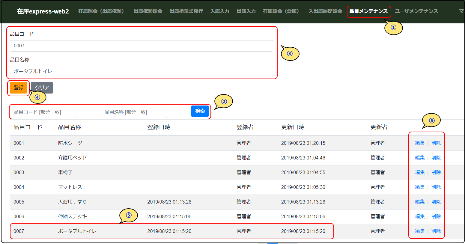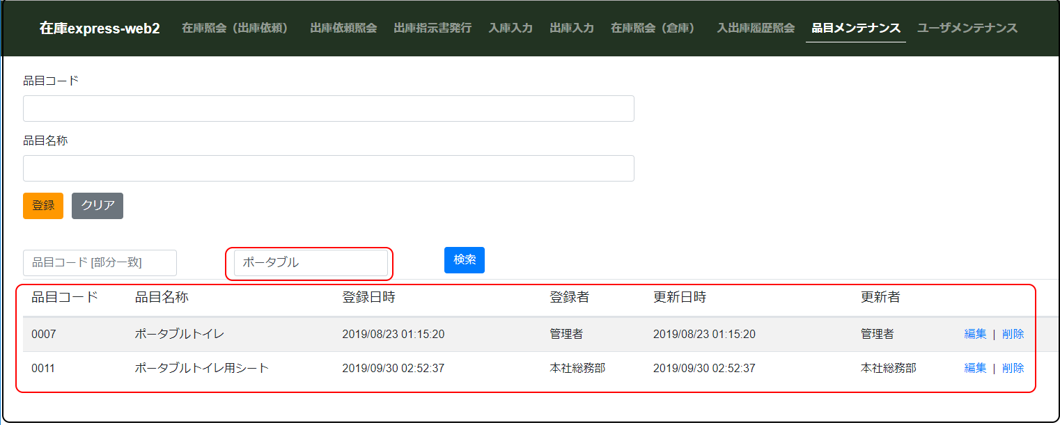 品目メンテナンスは、システム管理者及び倉庫管理者が使用します。品目コードと品目名称を登録または編集等を行うことができます。