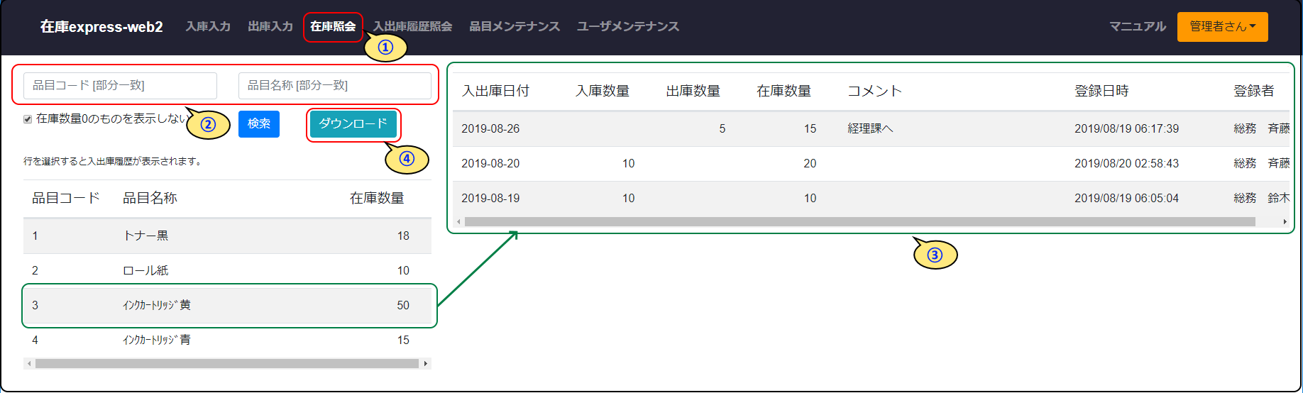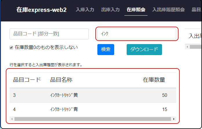③行を選択すると、その品目の入出庫履歴が表示されます。