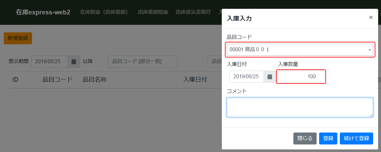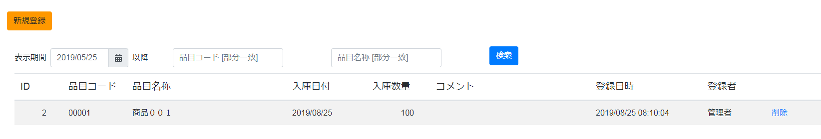 商品を登録し、その商品の入庫データを登録して、在庫が増えていることを確認しましょう。