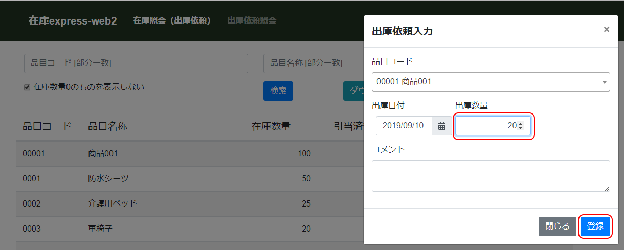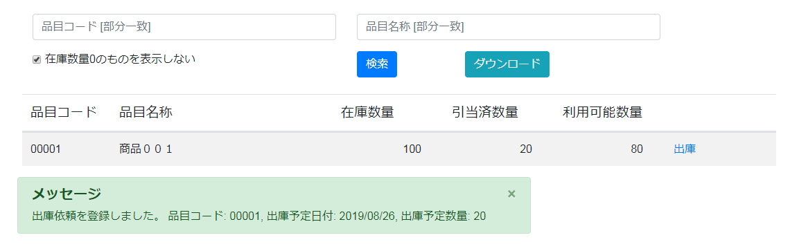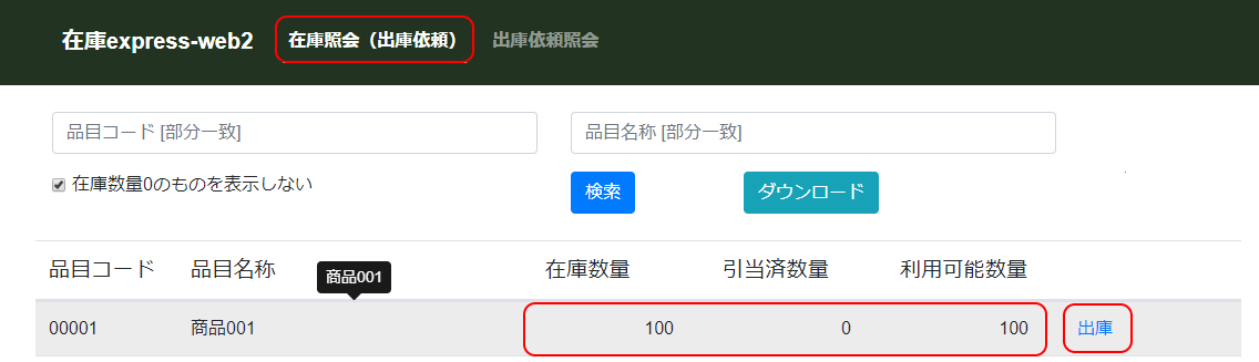 左側の在庫表示欄で、先ほど出庫指示した数の在庫が減っていることを確認します。