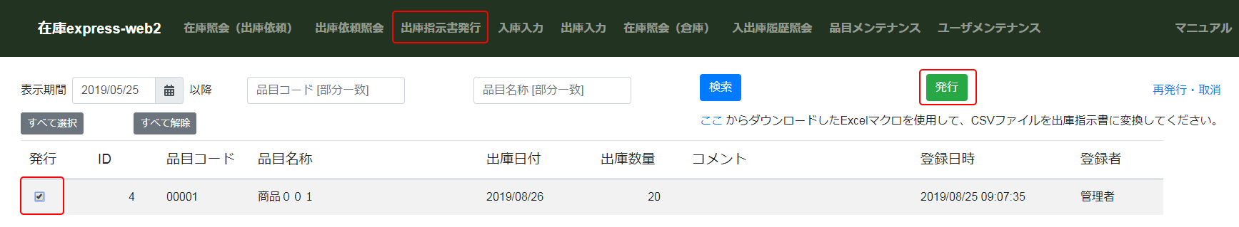 先ほど登録した出庫依頼データが表示されるので、左端の「発行」をクリックして選択します。