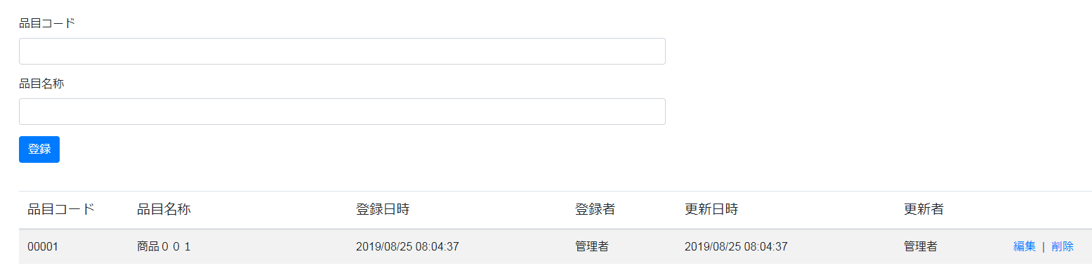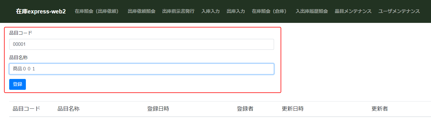品目コード・品目名称を入力し「登録」ボタンをクリックします。