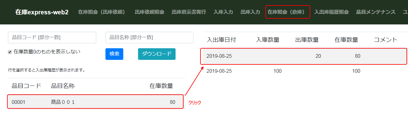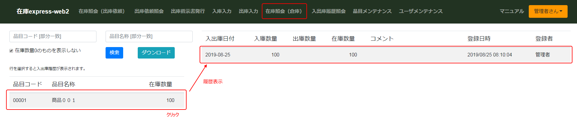在庫表示欄の行をクリックして、右側の入出庫履歴表示欄に入庫データが表示されていることを確認します。